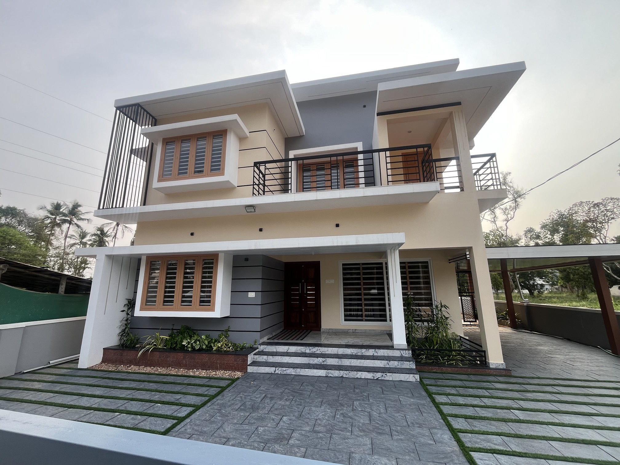 New villa located at Athani Thrissur. newly built house 2700SqFt, 7.5 Cent semi-furnished, newly posh villa got 4 bedroom, generous living space, stylish finished Dining, Kitchen platform with black granite counter top and stainless steel sink with single bowl and drain board, wardrobes, 4bathroom, common toilet, generous Balcony, wide work area, Superior quality vitrified tile flooring, brand vitrified tiles in sit out, living, dining, bedrooms, kitchen and balcony and ceramic tiles in toilets and work area, Unlimited natural water supply through the internal pipeline from the open well. This home beautifully planned that whenever you step out you witness an abundance of verdant greens.