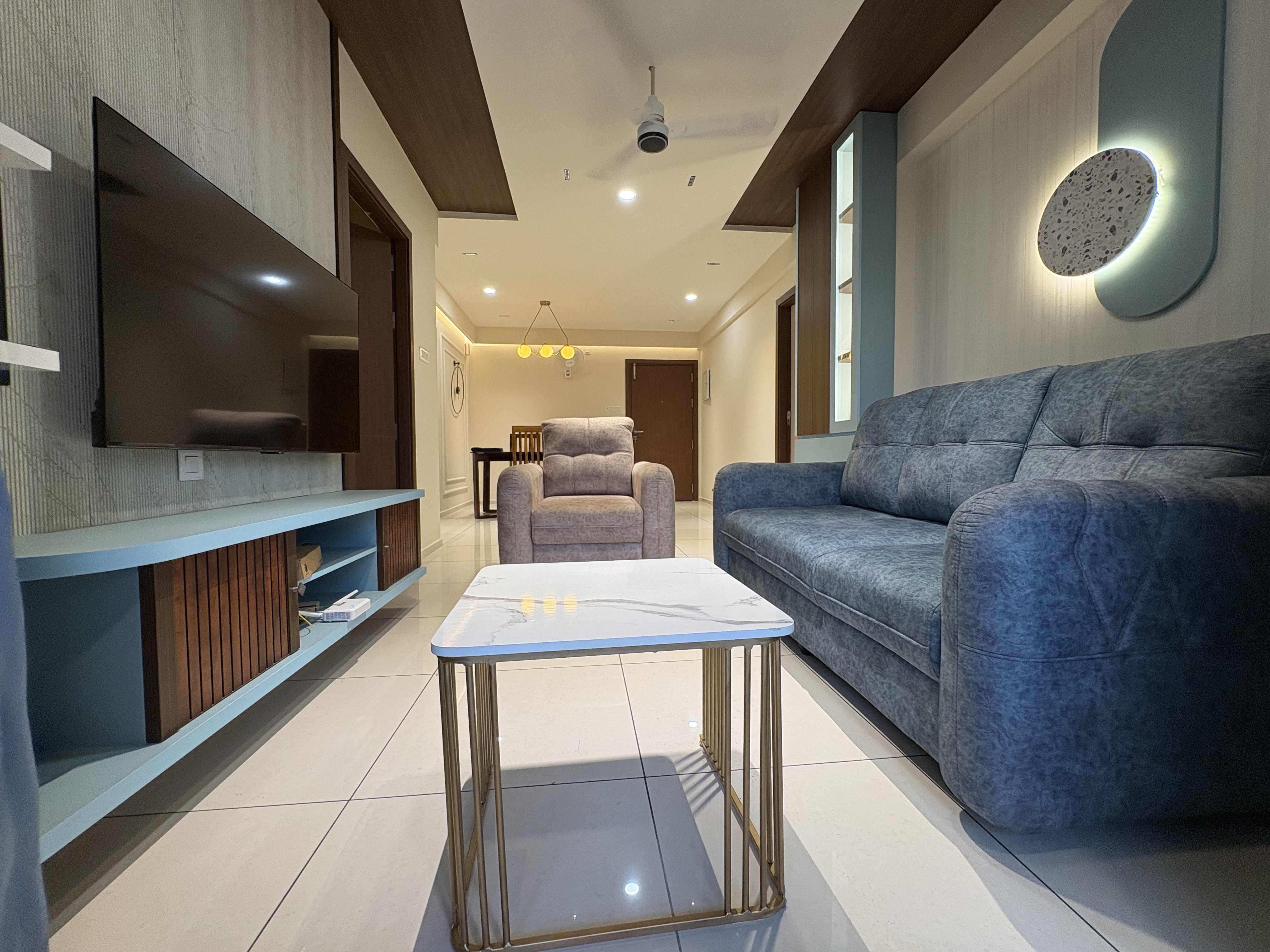 Furnished 2 bed room 1063 Sqft G+4 apartment available for sale at Sakthan Thrissur. This appealing flat consist of Spacious Living, Dining, kitchen, black granite Kitchen platform counter top with honed edges and stainless steel sink, Water Purifier provision, exhaust provision, Premium counter top wash basin for dining, Concealed plumbing with ASTM pipes for water supply. Furniture include: 2 cot with bed, dining table with chair, sofa settee, washing machine, , refrigerator,2 AC, LED TV, Counter top wash basin and wall mounted EWC in the master bathroom, Panels of superior quality for false ceilings, Shower with diverter facility in the master bathroom, High quality vitrified tiles for the entire apartment, with vitrified skirting, , fabulous 1 balcony, , Service Tax, security Deposit, car parking charges All are Inclusive, Fully Automated Entrance gate, Nature view premium villa- You will definitely appreciate a smog-Free environment which is interactive and truly charming with the scenery.