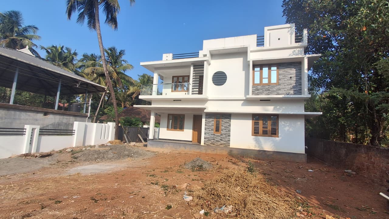Brand New villa located at Olari Manakkody Thrissur. newly built house 1950SqFt,10Cent semi-furnished, newly posh villa got 4 bedroom, generous living space, stylish finished Dining, Kitchen, wardrobes, 4bathroom, common toilet, generous Balcony, wide work area, brand vitrified tiles in sit out, living, dining, bedrooms, kitchen and balcony and ceramic tiles in toilets and work area, Surrounded compound wall with entrance gate, Unlimited natural water supply through the internal pipeline from the open well. This home beautifully planned that whenever you step out you witness an abundance of verdant greens.